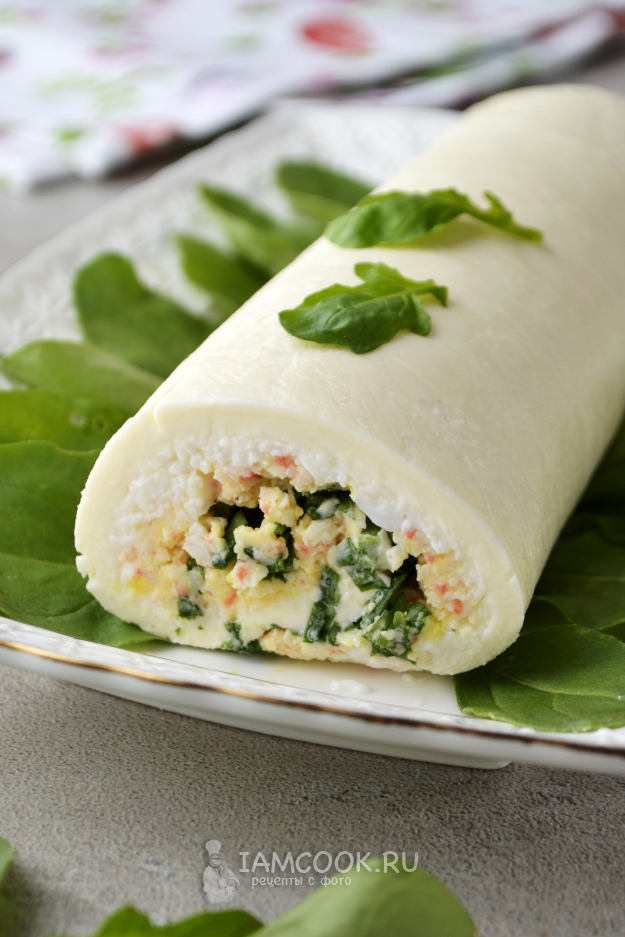 Хорошо охлажденный рулет из плавленых сырков с крабовыми палочками подавайте к столу, украсив по желанию.