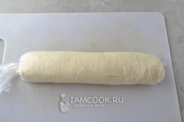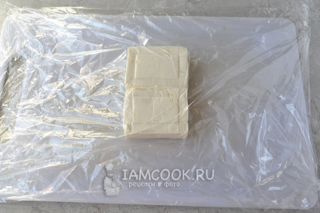 Плавленые сырки заранее достаньте из холодильника, чтобы их можно было легко раскатать. Сырки положите внутрь полиэтиленового пакета или между двумя слоями пищевой пленки.