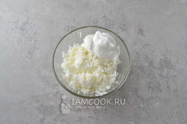 Белки натрите на мелкой терке в другую посуду, посолите и добавьте сметану. Перемешайте.