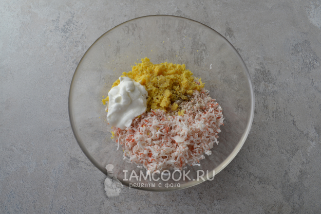 В глубокую миску натрите крабовое мясо на мелкой терке. Яйца разделите на белки и желтки. Желтки натрите или раскрошите в миску, добавьте половину сметаны, поперчите и посолите по вкусу. Перемешайте.