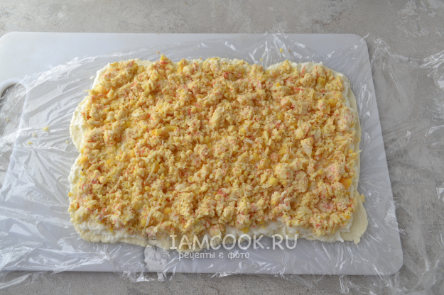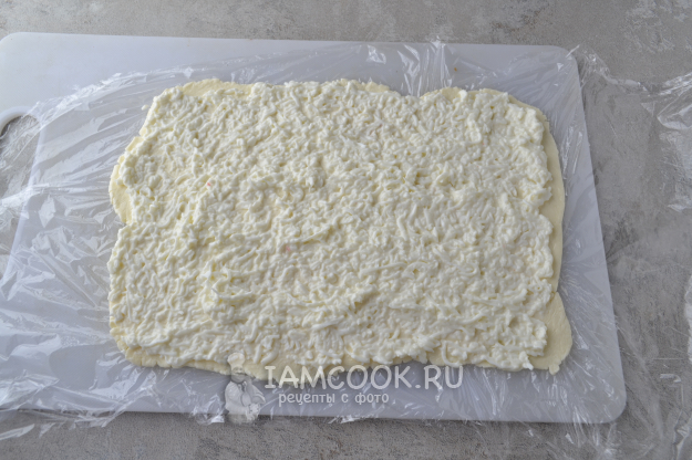 Снимите верхний слой пленки или разрежьте пакет, чтобы освободить раскатанные сырки. Равномерно разложите натертые белки на пласт.