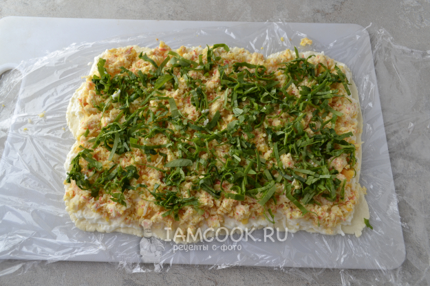 Зелень нарежьте и равномерно разложите по всей поверхности пласта.