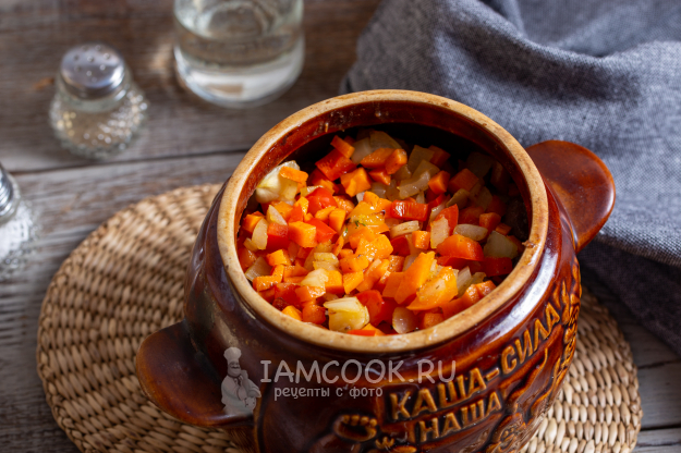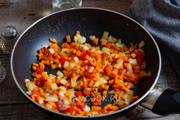 Овощи - перец, лук и морковь - помойте, почистите и порежьте мелким кубиком. В той же сковороде, где жарилось сердце, обжарьте овощи несколько минут.