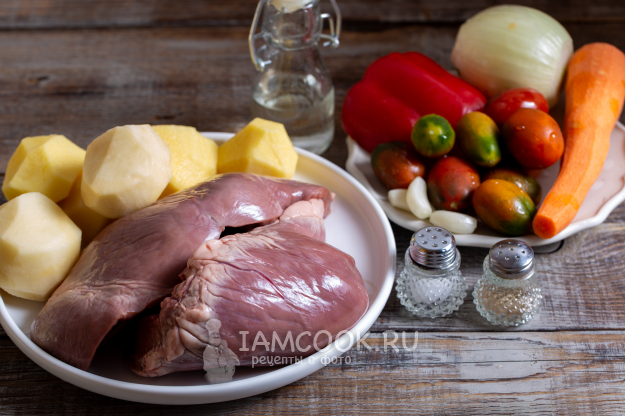 Возьмите указанные ингредиенты для приготовления свиного сердца с картошкой в горшочке в духовке. Сердце берите свежее, ранее не замороженное. Овощи - среднего размера. Помидор - один крупный или 5-6 черри. Специи все берите по своему вкусу - молотые перцы, паприку, кориандр и т.д.