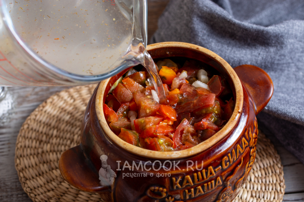 В горячей воде растворите соль, специи и вылейте в горшочки, чтобы жидкости было в половину горшочка. Мои горшочки - по 500 мл, воды наливала по 150 мл.