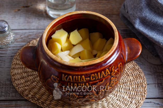 Картофель помойте и очистите от шкурки. Порежьте кубиком и выложите в выбранные горшочки для запекания.