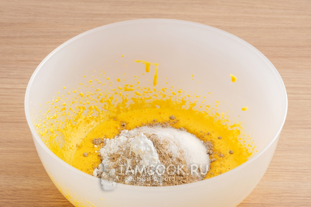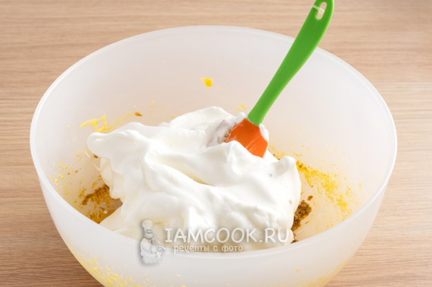 Первым делом отделите белки от желтков и взбейте желтки с половиной порции сахара (50 г) до пышности.