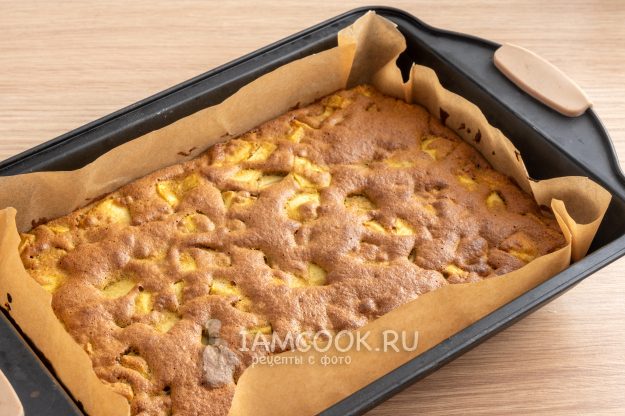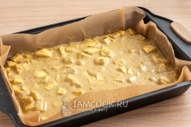 Форму для выпечки застелите пергаментом или смажьте маслом. Переложите тесто с яблоками в форму.