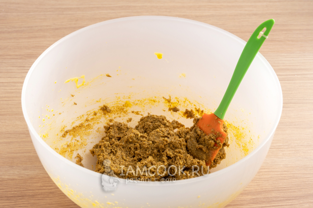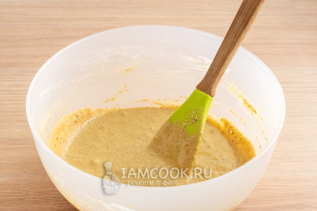 Хорошенько размешайте массу лопаткой. Масса получится достаточно густой на этом этапе.