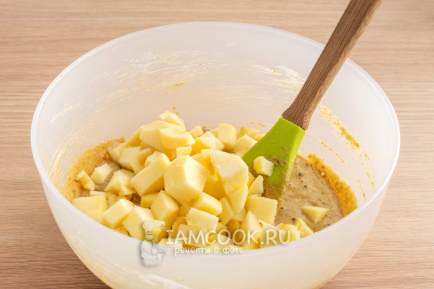 Порежьте очищенные яблоки кубиками и положите их в тесто. Перемешайте.