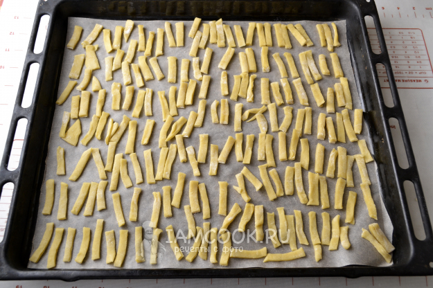 Противень застелите пекарской бумагой и разложите лапшу. Поставьте противень в заранее разогретую до 180°С духовку. Подсушите лапшу до легкого румяного цвета. Не пересушите!
