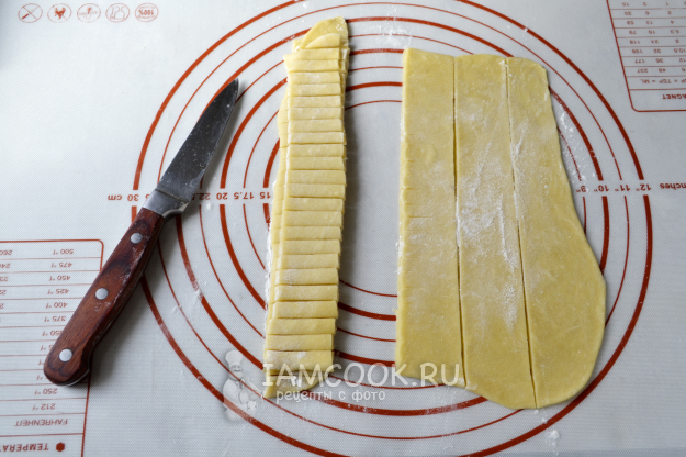 Разделите тесто пополам для удобства раскатывания. Раскатайте в тонкий пласт, разрежьте по полоски шириной 2-3 см.