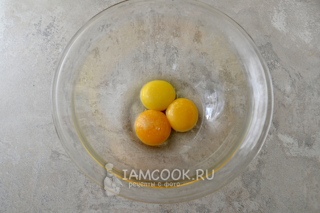 Разделите яйца на белки и желтки. В миску к желткам добавьте столовую ложку воды и щепотку соли, взболтайте вилкой.