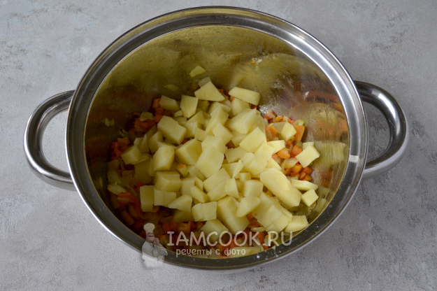 Положите в кастрюлю очищенный и нарезанный кубиком картофель.