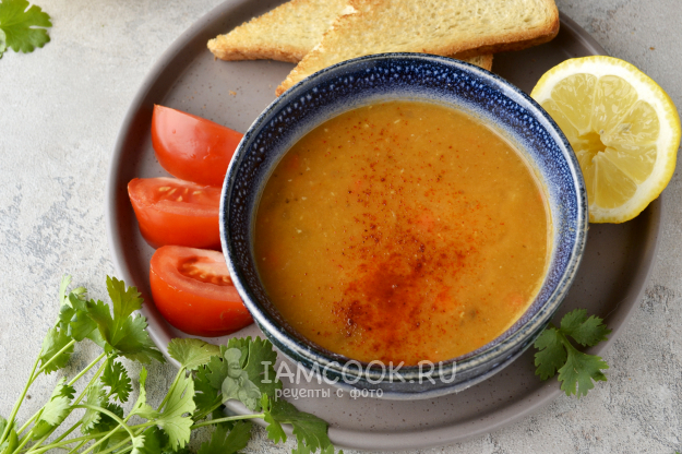 Готовый суп пюрируйте погружным блендером до состояния однородного пюре. Турецкий жареный суп с красной чечевицей готов.