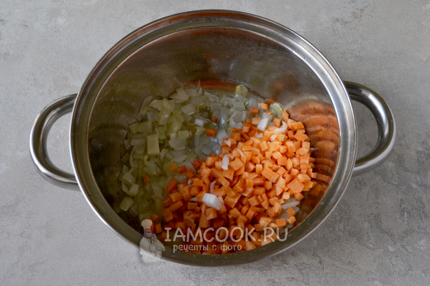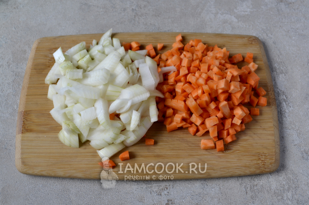 Нарежьте мелким кубиком очищенные лук и морковь.