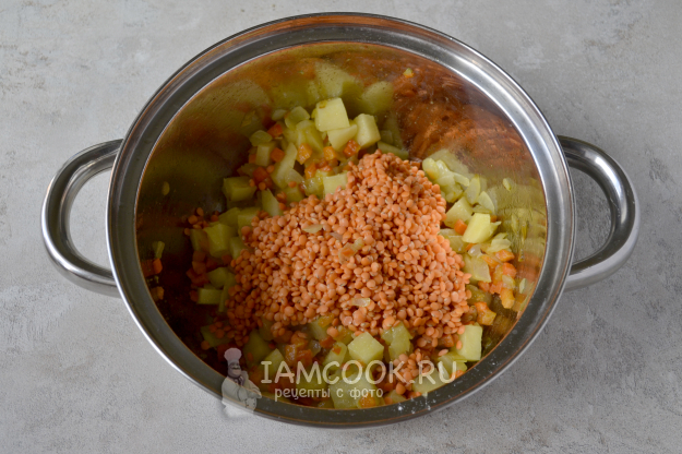 Перемешайте картофель с овощами, обжаривайте 3-4 минуты и добавьте промытую красную чечевицу.