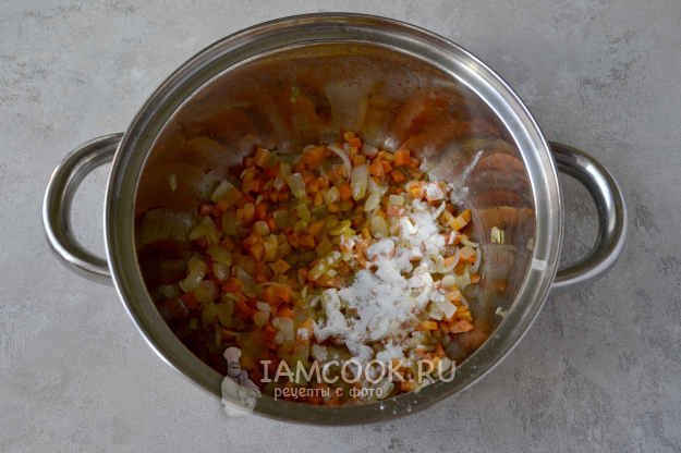 Всыпьте в кастрюлю муку. Перемешайте муку с овощами и обжаривайте пару минут.