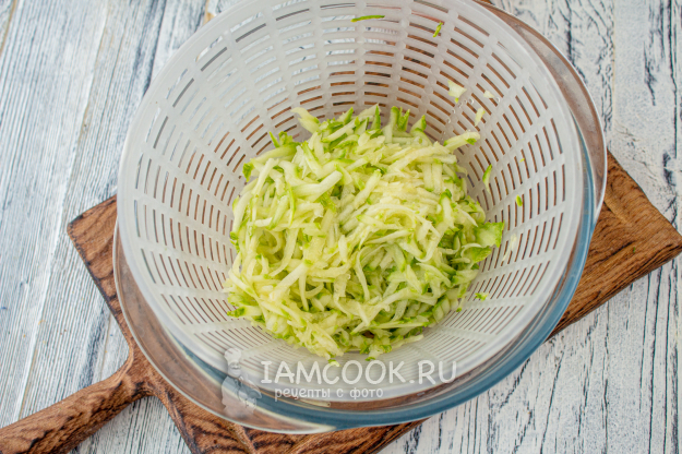 Так как у меня кабачок молоденький, с тонкой кожицей, то я ее не очищала. Если у вас старый, то желательно ее очистить. Кабачок промойте, обсушите и натрите на терке. Выложите в сито и оставьте на 5 минут, чтобы он пустил сок, затем хорошо отожмите его.