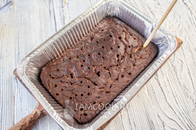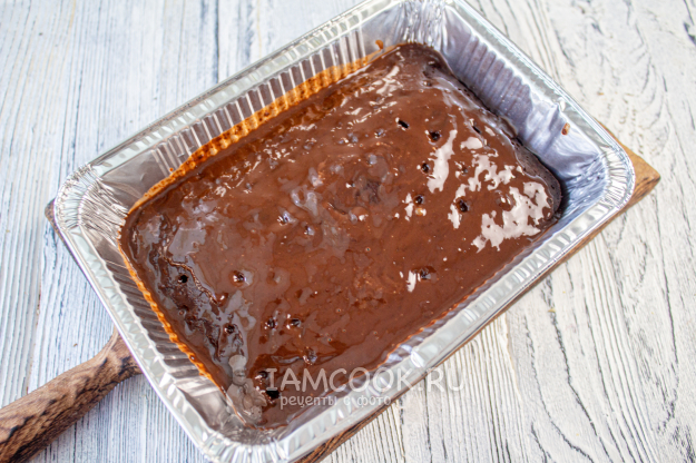 Испеченный брауни достаньте из духовки, оставьте в форме немного остыть (минут 10-15). Затем при помощи палочки для суши сделайте проколы по всему пирогу, так глазурь его пропитает и сделает вкус более насыщенным, шоколадным.