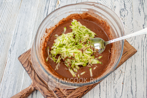 К полученному тесту добавьте отжатый от сока кабачок и хорошо перемешайте.