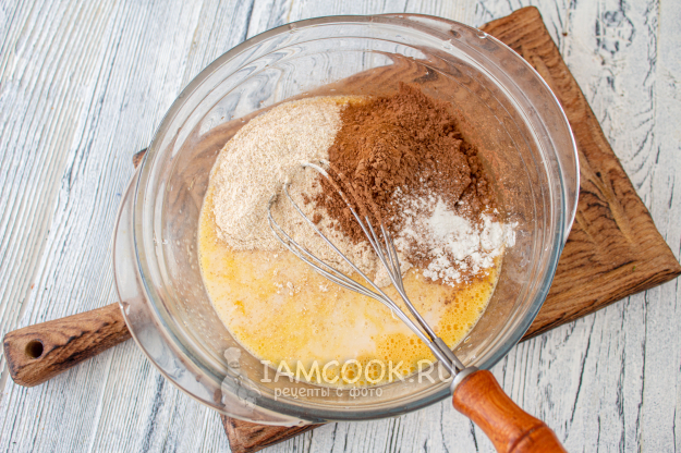 К яично-молочной смеси просейте муку, какао-порошок и разрыхлитель.