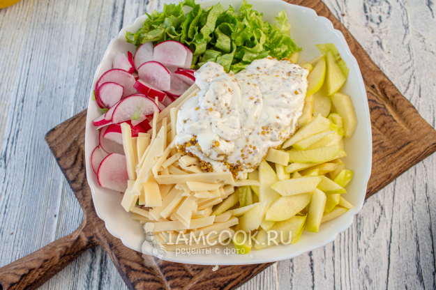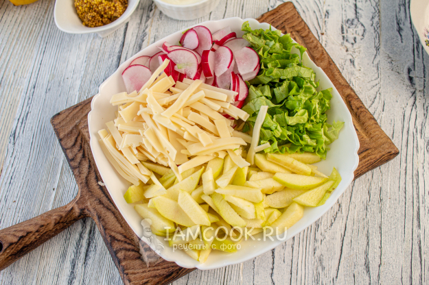 Редис промойте, обсушите, срежьте хвостики и плодоножку. Нарежьте его на тонкие дольки, или если редис мелкий, то тонкими кружочками. Сыр нарежьте как яблоко, тонкими брусочками. Выложите редис и сыр в посуду, где собираете салат.