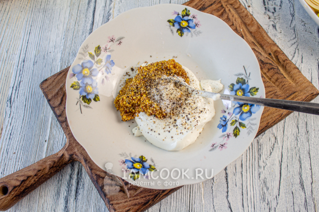 Подготовьте заправку: в миске соедините сметану, горчицу, соль и черный молотый перец по вкусу.