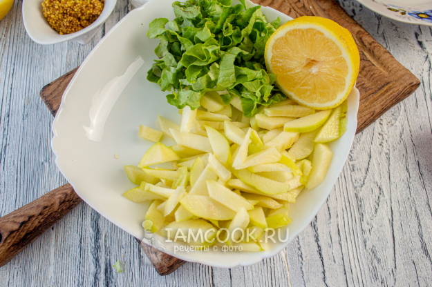 В салате лучше использовать кисло-сладкое яблоко, а также листья салата можно заменить на те, которые вам больше нравятся.