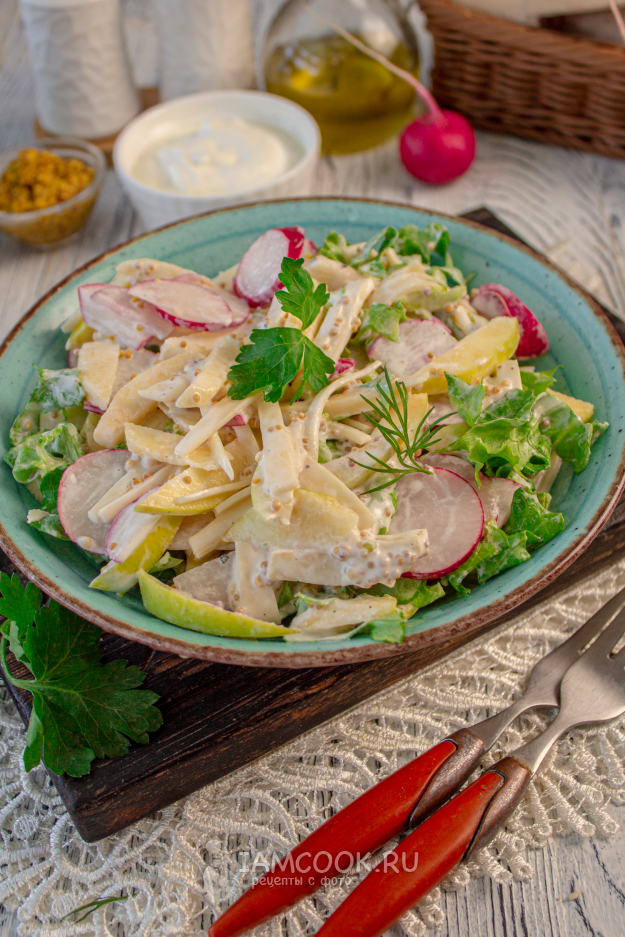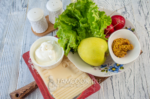 Подготовьте все необходимые ингредиенты для салата с редисом, яблоком и сыром.