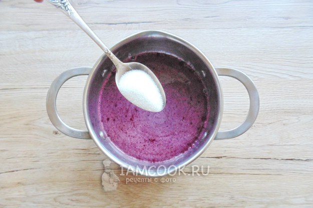 В кастрюлю с ягодой добавьте еще 400 мл воды. Насыпьте сахар по вкусу, мне хватило 70 граммов. Поставьте кастрюлю на плиту и доведите до кипения. Сахар должен полностью раствориться.