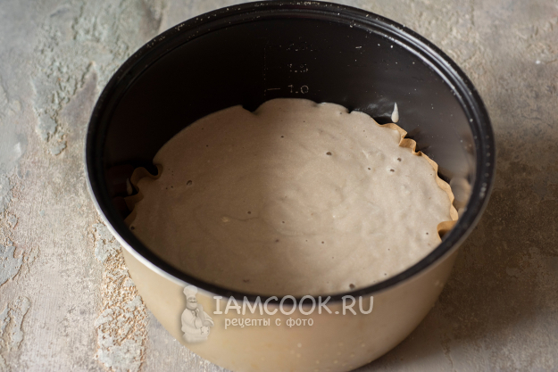 На дно чаши выложим кусочек пергамента для выпекания, зальем все тесто.