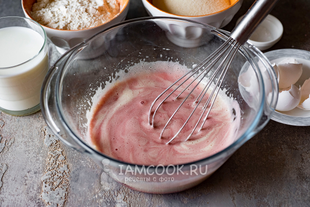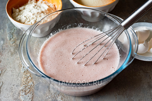 К взбитым яйцам зальем вишневое варенье и растительное масло. Перемешаем.