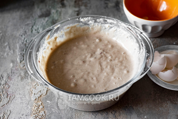 Замесим однородное тесто по консистенции как сметана средней жирности. Миску с тестом оставим в покое на 30 минут, чтобы манка набухла.