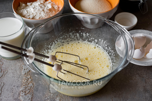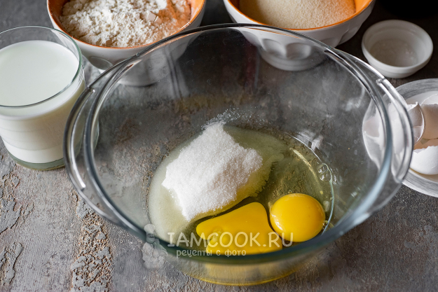 В миску вобьем яйца, засыплем сахар.