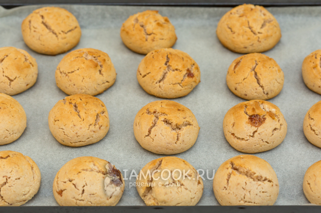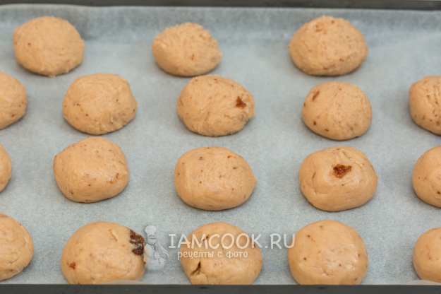 Заготовки (их количество будет зависеть от размеров печенья) выложите на противень, застеленный пергаментом.
