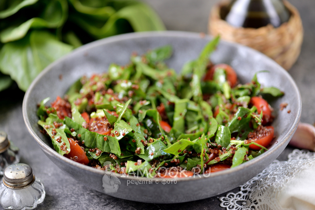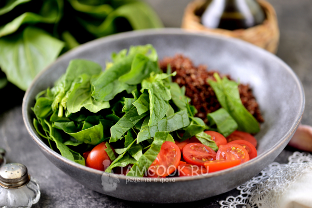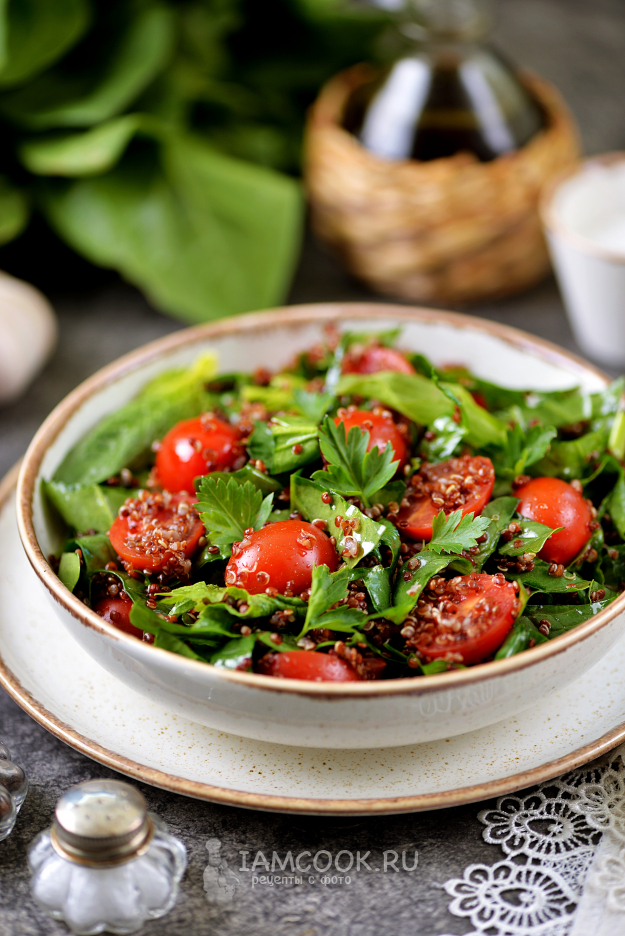 Сочный, вкусный и полезный салат с киноа и шпинатом готов! Разложите по порциям и подавайте к столу.
