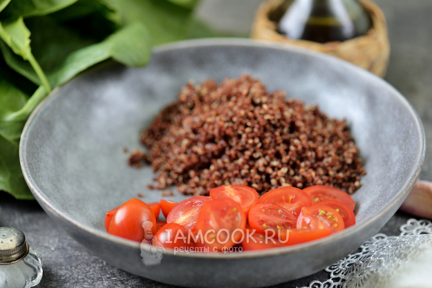 Готовую киноа переложите в глубокую миску, добавьте помидоры черри, разрезанные пополам.