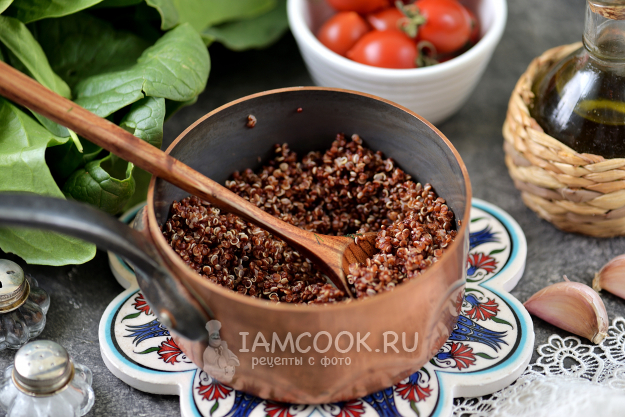 Киноа переложите в небольшой ковшик, залейте водой в пропорции 1 к 2, отварите на тихом огне около 20 минут, но читайте инструкцию на упаковке.