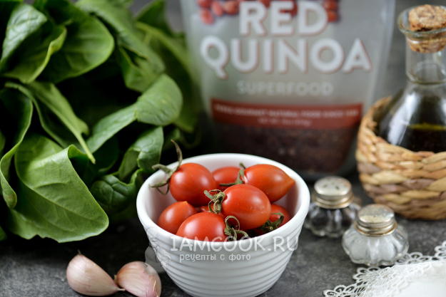 Подготовьте все продукты для салата с киноа и шпинатом по списку к рецепту.