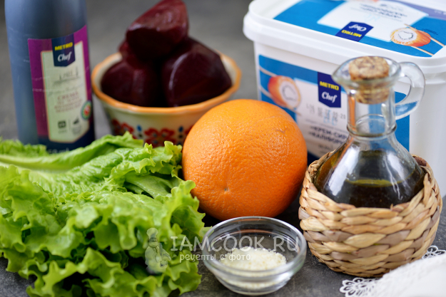 Для приготовления салата из свеклы с апельсином и сыром вам понадобятся все эти продукты. Свеклу заранее отварите до готовности, остудите и очистите от кожуры. Я купила мелкую молодую свеклу, она сварилась за 20 минут, старая будет готова минут за 35-40. Латук помойте и вытрите насухо бумажными полотенцами.
