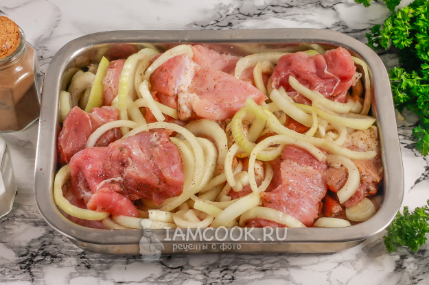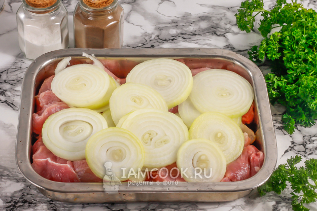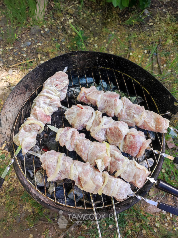 Спустя полчаса насадите мясо на шампуры поочередно с кольцами лука.