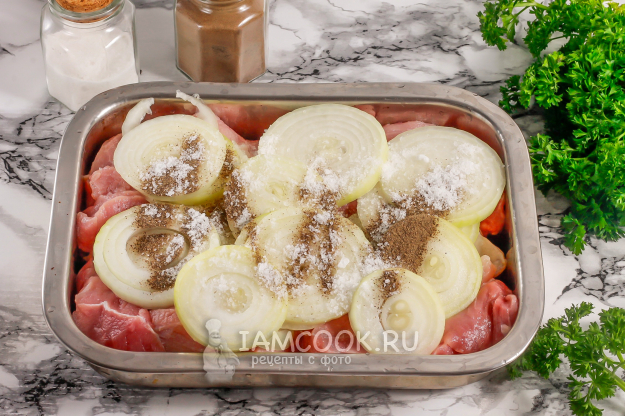 Посыпьте солью и молотым черным перцем. На этом этапе вы можете добавить и другие специи, например - для шашлыка. Если готовите блюдо из баранины, то желательно их добавить, чтобы перебить терпкий вкус этого сорта мяса.