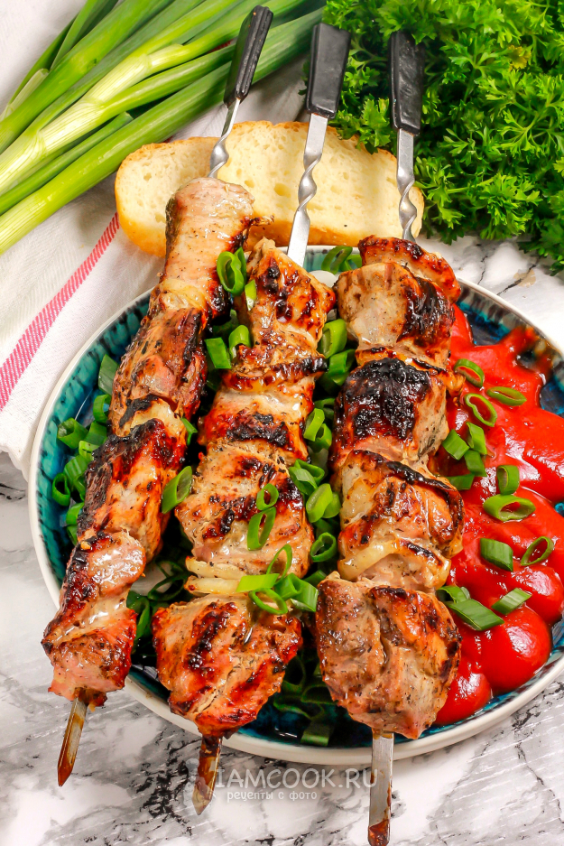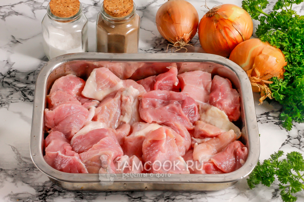 Возьмите необходимые ингредиенты для приготовления вкусного и румяного шашлыка по-сталински (с маринадом из белого вина и кефира).