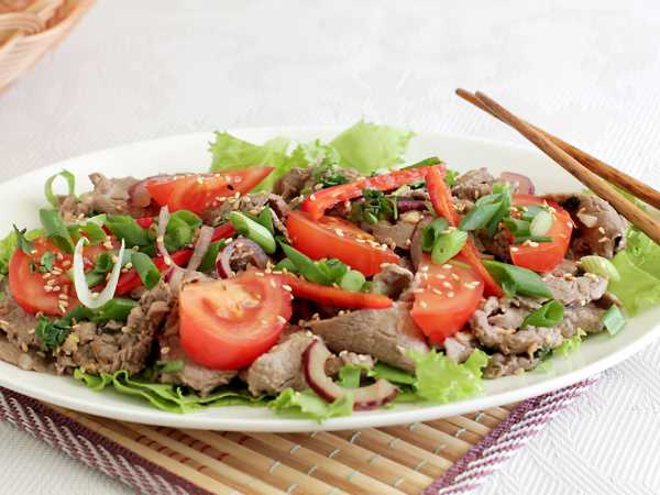 На тарелку выложить листья салата, сверху мясо с соусом, затем помидоры. Посыпать зеленью, зеленым луком, кунжутом. Тайский салат с говядиной готов.