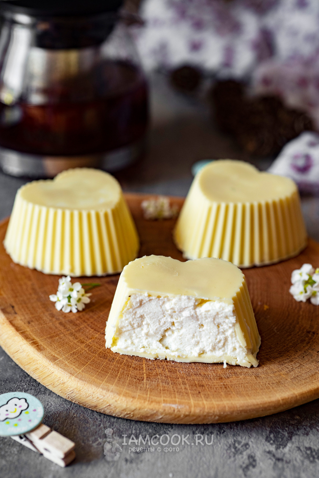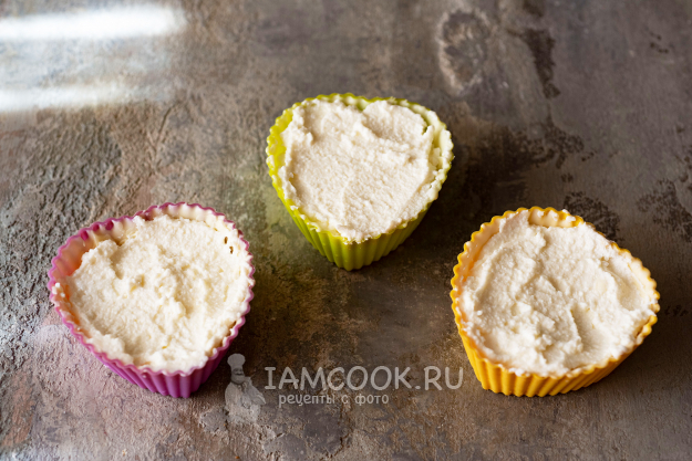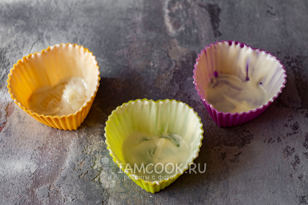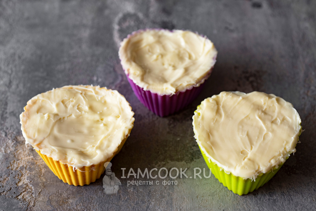 И поверх творожной массы выложим и равномерно распределим остатки растопленного белого шоколада. Отправим заполненные формочки в морозильную камеру на 30 минут.