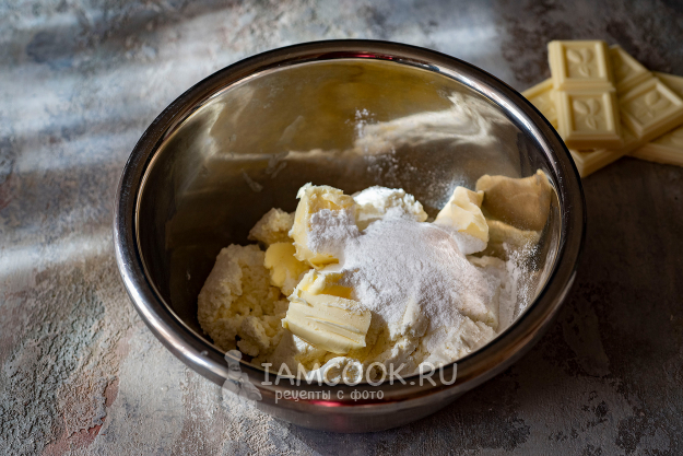 В миску выложим творог, добавим сахарную пудру и мягкое сливочное масло.