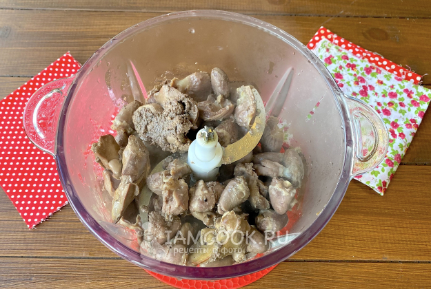 Извлеките печень, сердца и желудки из бульона и поместите в чашу измельчителя.