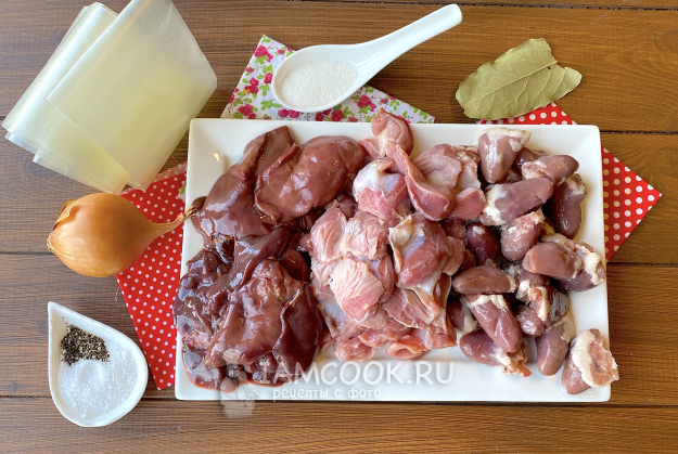 Подготовьте все необходимые продукты и приступайте к приготовлению куриной ливерной колбасы (из куриных субпродуктов).