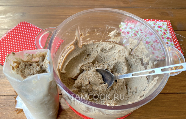Разведите желатин в 200 мл бульона и прогрейте, но НЕ КИПЯТИТЕ, затем вылейте в чашу. Добавьте мускатный орех и измельчите в однородную массу. Если вам покажется, что масса слишком густая, добавьте еще немного бульона.